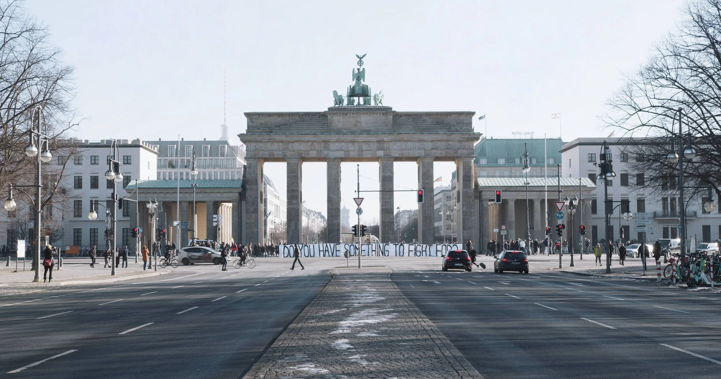 On February 22, this intervention took place directly beside the Brandenburg Gate — one of Europe’s most politically and symbolically charged landmarks. Once a site of historical division, later a symbol of reunification, and now a stage for contemporary struggles, it invited the public to confront a fundamental question: DO YOU HAVE SOMETHING TO FIGHT FOR?